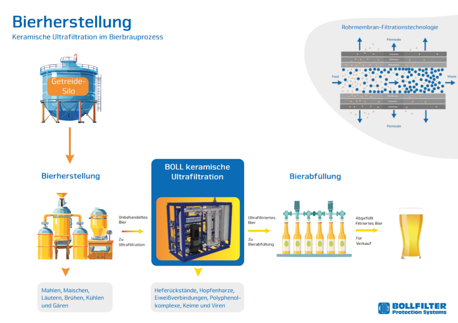 Die Membrananlage verwendet keramische Membranen im Ultrafiltrationsbereich, um die unerwünschten Trübstoffe, wie Hefe und Eiweißgerbstoffverbindungen aus dem Bier zu entfernen