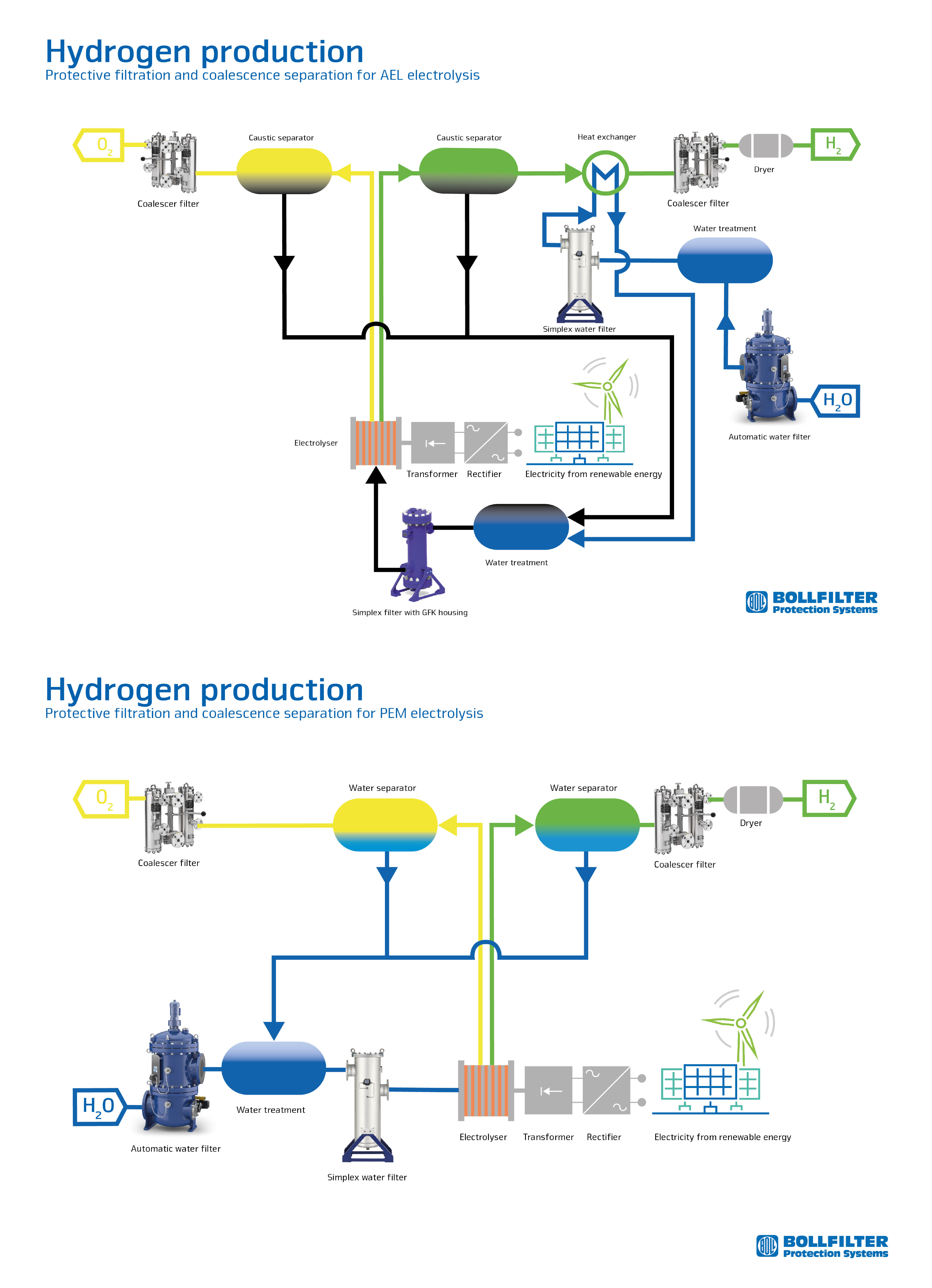 La production d'hydrogène vert ("Power to H2") est la discipline clé de toutes les technologies "Power to X". BOLL & KIRCH est un leader dans toutes les solutions de filtration de la chaîne de valeur complète - de la production d'énergie renouvelable à l'utilisation d'hydrogène vert.