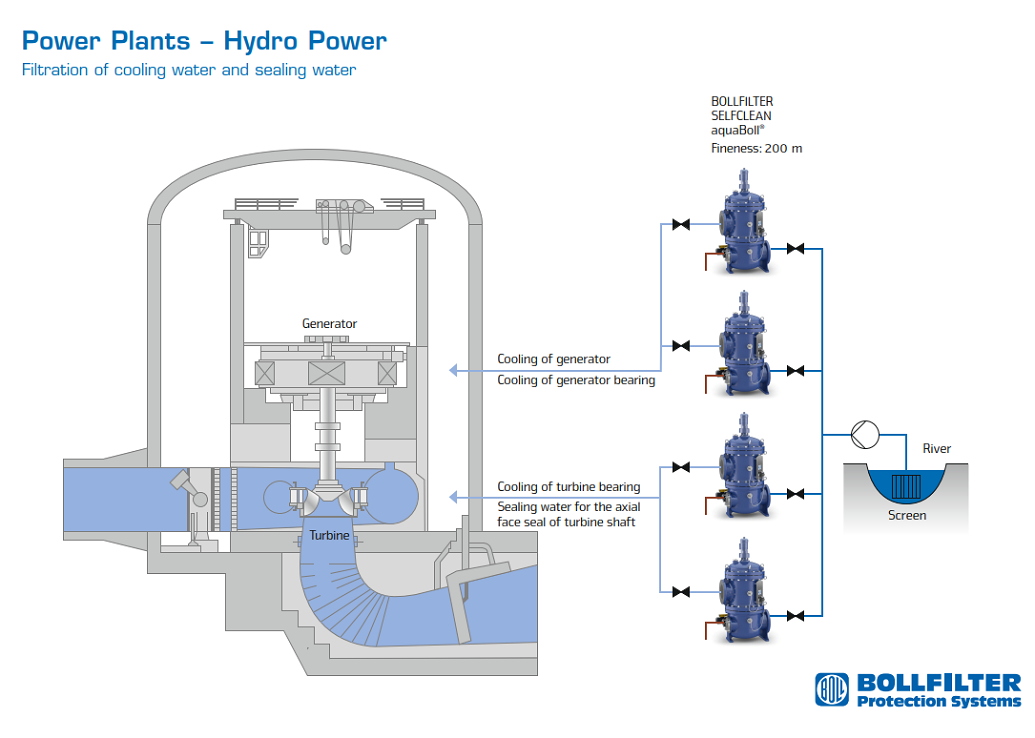 Le filtre automatique aquaBoll® élimine les particules potentiellement dangereuses de l'eau de rivière non traitée et protège les générateurs et les turbines des centrales électriques. Le filtre entièrement automatique fonctionne en continu avec un programme de lavage à contre-courant prédéfini et assure une filtration efficace sans nettoyage ni entretien réguliers.
