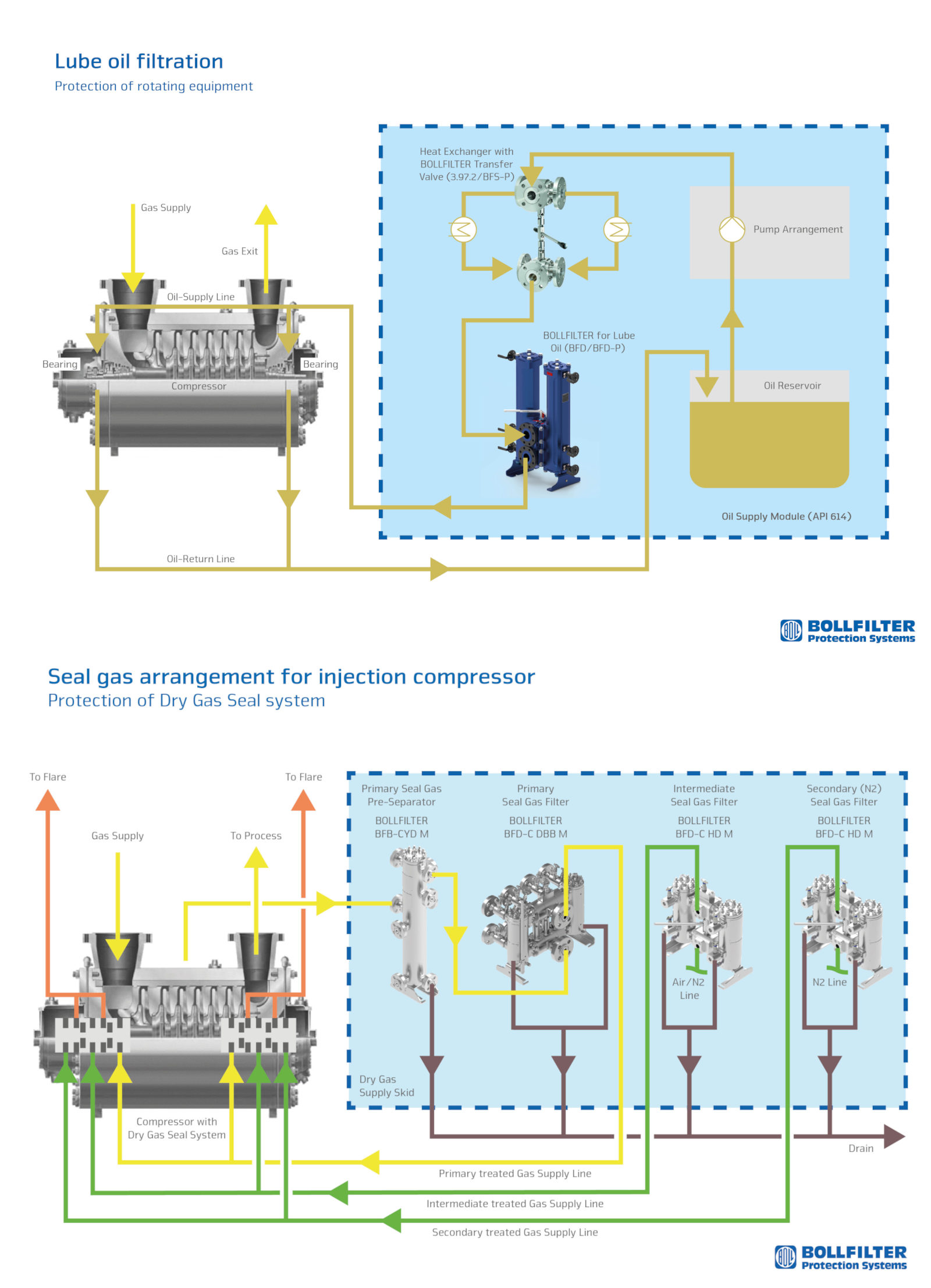 Filtration de l'huile de lubrification et des gaz d'étanchéité pour protéger les roulements et éviter d'endommager les surfaces d'étanchéité.