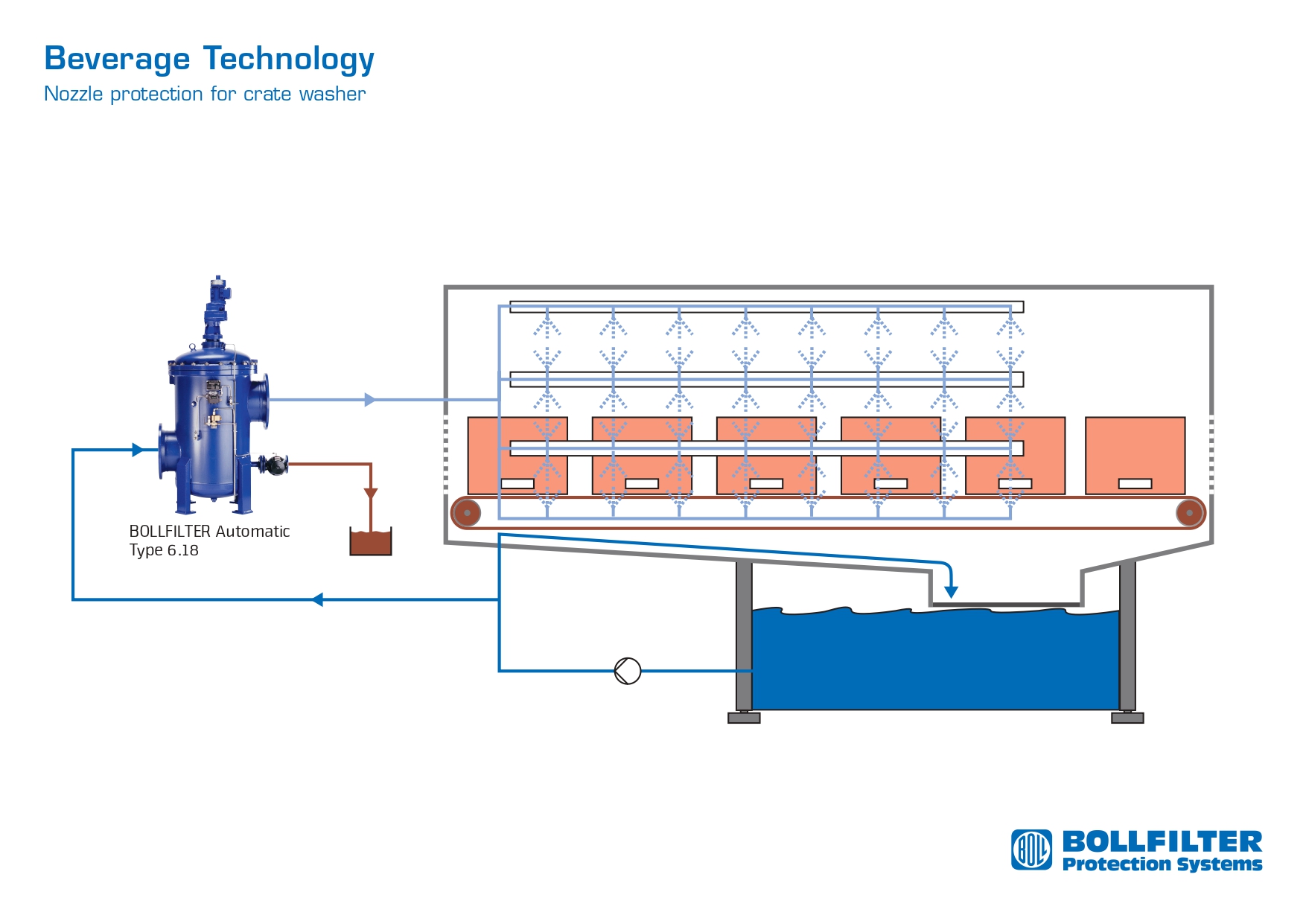 O filtro automático da BOLLFILTER Modelo aquaBoll® / 6.18 protege o sistema de bocais contra bloqueios e aumenta simultaneamente a qualidade de limpeza das caixas. Ao mesmo tempo, o esforço de manutenção e o risco de falhas não programadas são reduzidos.